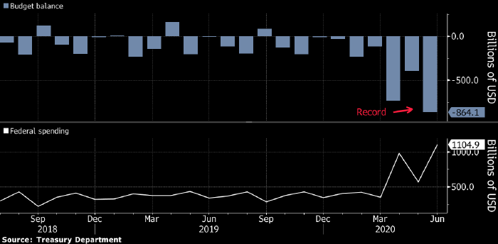 Дефицит бюджета США достиг в июне рекордных $864.1 млрд на фоне резкого увеличения расходов и падения доходов. Расходы федерального правительства США выросли за год в три с лишним раза на фоне борьбы с экономическими последствиями коронавируса и достигли в июне $1.1 трлн (см. график выше). Примерно половина этих денег ($511.4 млрд) пошла на помощь малому бизнесу.