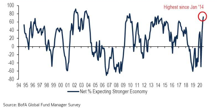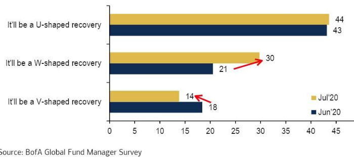 72% инвесторов (рекордное значение с января 2014 года, которое на 11% выше июньских цифр. См. график выше) прогнозируют ускорение роста мировой экономики, но почти никто не думает, что ее восстановление будет иметь форму «V», пишет Bank of America. Таковы результаты ежемесячного опроса «резидентов» Wall Street, управляющих активами в $607 млрд, который провел банк в период со 2 по 9 июля.