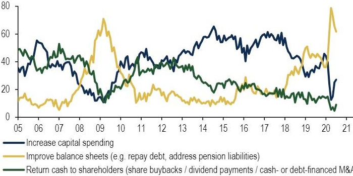 62% инвесторов хотят, чтобы компании улучшили свои балансы, 27% хотели бы видеть увеличение капитальных расходов и лишь 9% предпочитают увеличение дивидендов и/или объема программы обратного выкупа акций («buybacks», см. график ниже).