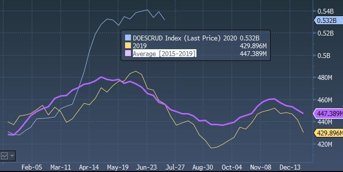 График запасов нефти в США: за последние 5 лет (фиолетовая линия), в 2019 году (желтая линия) и в 2020 году