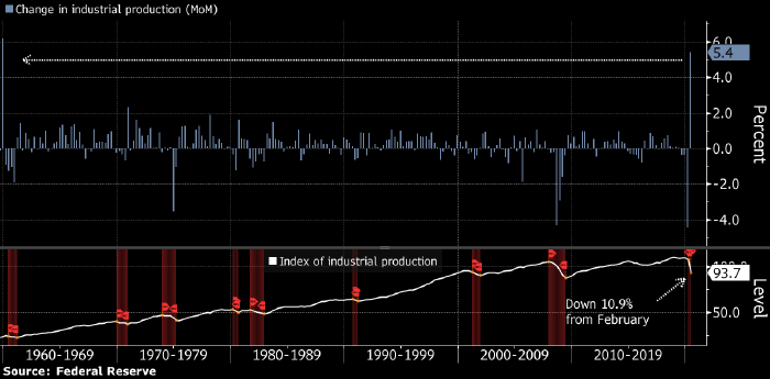 Промышленное производство в США (включает в себя производство на заводах и фабриках, в сфере ЖКХ, а также в сфере добычи полезных ископаемых) выросло в июне на 5.4% м/м, что стало рекордным значением с 1959 года (см. график выше), пишет Bloomberg со ссылкой на данные ФРС. Аналогичный показатель только для заводов и фабрик взлетел на рекордные с 1946 года 7.2% м/м.