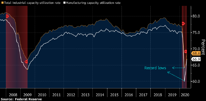 Несмотря на это, Индекс промышленного производства США все еще остается на 10.9% ниже февральского докризисного уровня, а низкий уровень загруженности производственных мощностей говорит о довольно вялом росте спроса. Кроме того, продажи промышленных товаров могут в ближайшие месяцы вновь сократиться на фоне повторного введения ограничительных мер в некоторых крупных штатах, прогнозирует Bloomberg.