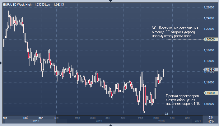 В Societe Generale отмечают, что, если прогресс всё же будет достигнут и дорога к созданию фонда будет открыта, евро может получить хороший заряд для роста к 1.20 в следующие несколько месяцев. В свою очередь, провал переговоров на саммите, который закончится 18 июля, может оказать пагубное влияние на настрой инвесторов и спровоцировать снижение EURUSD, возможно даже к 1.10 — в SG напоминают о довольно большом нетто-лонге спекулянтов в евро.