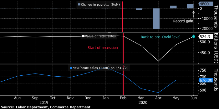 В мае-июне количество новых рабочих мест вне с/х сектора США выросло на 7.5 млн, однако число американцев, получающих пособия по безработице, остается стабильно высоким и составляет 17 млн. Тем временем вирус продолжает создавать неопределенность: уже 22 штата либо отложили смягчение ограничительных мер, либо вовсе его отменили, подсчитали экономисты Bank of America.