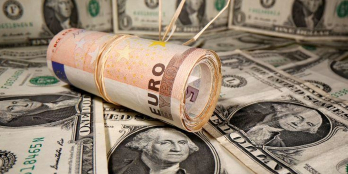 На этой иллюстрации, сделанной 26 мая 2020 года, свернутые банкноты евро размещены на банкнотах доллара США. REUTERS / Dado Ruvic