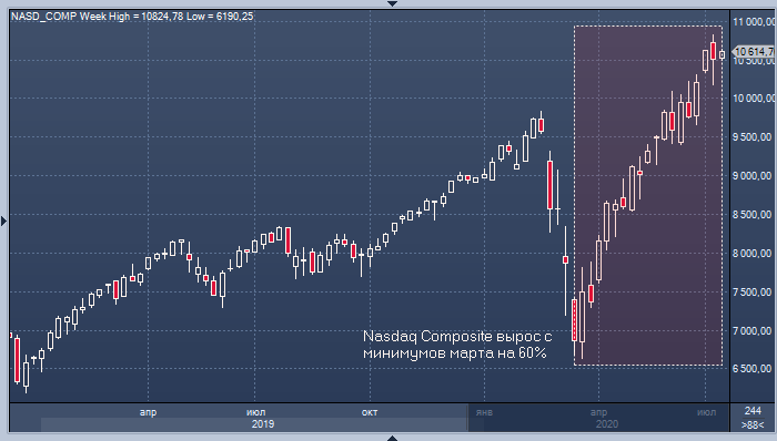 Nasdaq Composite вырос с минимумов 23 марта примерно на 60%. Именно в тот день ФРС объявила о целом ряде беспрецедентных программ, направленных на поддержку финансовых рынков в условиях спровоцированного коронавирусом кризиса.