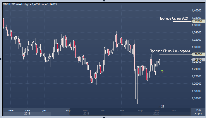 Многие эксперты отмечают, что смещение фокуса от фискальных и монетарных стимулов к фактическим показателям восстановления экономики негативно для фунта, который в настоящее время проигрывает конкурентам. Стратеги Citi считают, что в 2020 и 2021 Великобритания будет отставать от большинства развитых стран. Однако и в США перспективы роста в свете распространения коронавируса выглядят всё менее оптимистичными. В Citi полагают, что в краткосрочной перспективе GBPUSD выглядит уязвимым к новым приступам слабости, однако полагают, что возвращение уровням вблизи 1.24 стоит рассматривать как возможность для покупки с расчётом на новый этап роста оптимизма по поводу Брекзита — упорядоченный выход Великобритании из ЕС в интересах всех сторон — и укрепление фунта до 1.27 в трехмесячной перспективе. Citi придерживается прогноза по GBPUSD на четвертый квартал на уровне 1.28, в 2021 в банке ожидают возвращения пары к 1.37 на фоне улучшения ситуации в мировой экономики и общего ослабления позиций американской валюты в виду ультрамягкой политики ФРС.