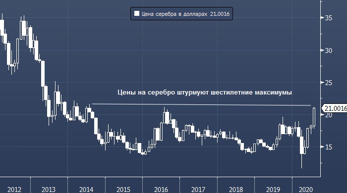 Цены на серебро взлетели до рекордных значений с июля 2016 года в области $21 за унцию и показали в этом месяце лучшую динамику, чем цены на золото. С начала года серебро подорожало примерно на 15%.