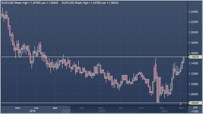 Евро на торгах во вторник, 21 июля, достиг к доллару максимума с января 2019 г. на уровне 1,1527. Предыдущий максимум, который являлся пиком 2020 г., на уровне 1,1495 был сформирован в марте.
