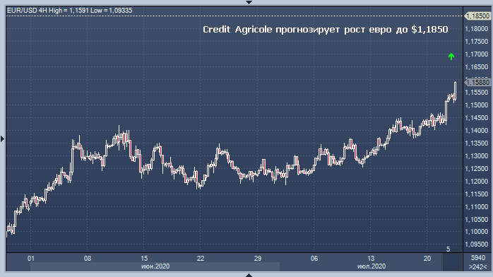 Евро должен подняться выше по отношению к доллару после сделки ЕС по созданию восстановительного фонда, при этом Credit Agricole прогнозирует рост до 1,1850 долл., а справедливой стоимостью в долгосрочной перспективе считает уровень 1,24 долл. Об этом сообщили стратеги французского банка Валентин Маринов и Мануэль Оливери.