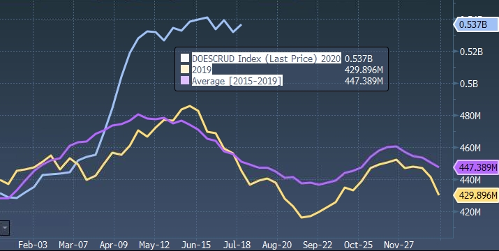 График запасов нефти в США: за последние 5 лет (фиолетовая линия), в 2019 году (желтая линия) и в 2020 году