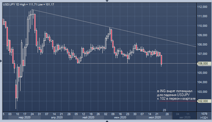 В ING отмечают, что попытки роста USDJPY могут оказаться привлекательными для продажи в краткосрочной перспективе. В банке придерживаются прогноза на четвертый квартал на уровне 105 иен за доллар и ожидают падения курса до 102 в первом квартале 2021.