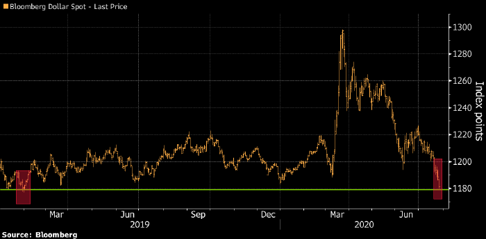 Индекс доллара DXY опустился ниже минимумов марта, аналогичный индекс от Bloomberg (BBDXY) потерял с начала месяца свыше 3%, достиг минимальных значений с февраля 2019 года (см. график выше) и закрыл снижением уже четыре недели подряд, что является наиболее продолжительным даунтрендом с начала 2019 года.