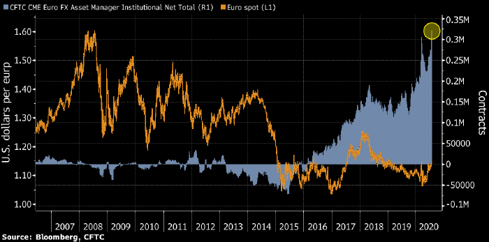 Крупные спекулянты продолжают продавать доллар против иены, евро (чистая длинная позиция институциональных инвесторов в евро/долларе достигла рекордного значения, см. график ниже), канадского доллара и швейцарского франка, следует из последних данных американской Комиссии по торговле товарными фьючерсами (CFTC). По данным Bloomberg, чистая некоммерческая короткая фьючерсная позиция по доллару против 8 основных валют достигла рекордных значений с апреля 2018 года.