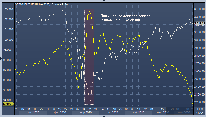 22 марта Индекс доллара, рассчитываемый ICE, достиг трехлетнего максимума, а на следующий день S&P 500 сформировал «коронавирусный» минимум (см. график выше). Затем курс доллара начал снижаться, а рынок акций США - расти. В настоящий момент Индекс доллара DXY опустился ниже минимумов начала марта, с которых начал заключительную фазу многолетнего роста, а S&P 500 находится примерно на 5% ниже рекордного значения, достигнутого 21 февраля.