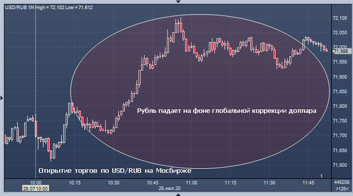 Рубль теряет к доллару 40 копеек с момента открытия Московской биржи и торгуется на 72,01 к 11:50 мск на фоне отскока валюты США на форексе, спровоцированного коррекцией цен на золото, которые вчера достигли абсолютных максимумов. Сырьевые и развивающиеся валюты также немного снижаются к доллару после их существенного роста накануне.
