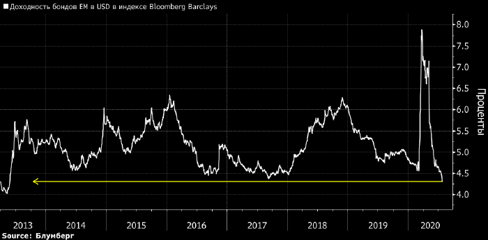В марте средняя доходность долларовых бондов EM в индексе Bloomberg Barclays достигла 11-летнего максимума в области 8%, но с тех пор снизилась почти в двое до текущих 4.32% (см. график выше).