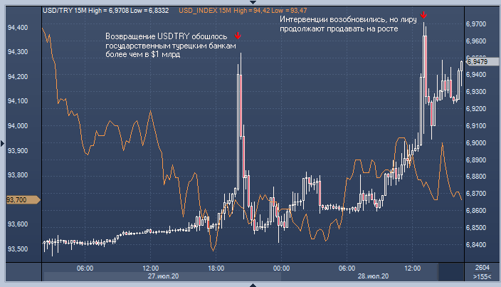 Источники Financial Times в финансовых кругах Лондона сообщили, что государственные турецкие в банки активно продавали доллар, чтобы удержать лиру от падения и потратили на это около $1 млрд. Такая же сумма ушла на интервенции и сегодня, однако эксперты сомневаются, что это удержит медведей по лире, особенно, если доллар прервёт своё падение. Они отмечают, что возможности Турции ограничены: резервы с учётом золота в этом году упали уже на $17 млрд до $89.5 млрд, а краткосрочные заимствования ЦБ валюты на внутреннем рынке, к которым он прибегает для проведения интервенций, в июне достигли рекордной отметки в $31.3 млрд, тогда как заимствования на рынке свопов достигли $54.4 млрд.