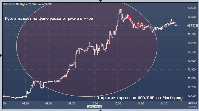 Рубль отметился к доллару на минимуме с 15 мая, 73,59, а к евро - на минимуме с 1 апреля, 86,50. К 11:35 мск пара доллар/рубль расчетами “завтра” была на уровне 73,43, и рубль теряет 1,4% от уровня предыдущего биржевого закрытия. В паре с евро рубль дешевеет на 1% до 86,29.