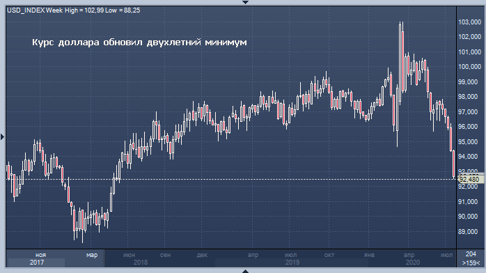 Доллар упал до самого низкого уровня за последние два года после того, как США сообщили о рекордном снижении валового внутреннего продукта и росте безработицы. Доллар США ослаб по отношению ко всем своим аналогам из Группы 10, с опережением против шведской кроны и японской иены. Финансовые потоки конца месяца и импульс продаж доллара обеспечили рост евро и фунта, рассказал азиатский валютный трейдер.