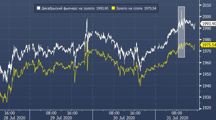 Цены на золото выросли в июле на 10% с лишним и готовятся закрыть лучший месяц за последние восемь лет, а цены на серебро - лучший месяц с 1979 года. Сегодня декабрьские фьючерсы на золото на Comex краткосрочно превысили отметку $2000 и достигли $2005.4 за унцию (см. график выше). Этот контракт является наиболее ликвидным в Нью-Йорке.