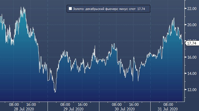 За последние три дня разница между ценой декабрьского фьючерса на Comex и спот-ценой золота выросла с $11.5 до $21 за унцию (см. график ниже). Вполне возможно, что покупатели этого контракта страхуются таким образом от неопределенности, связанной с исходом ноябрьских выборов президента США.