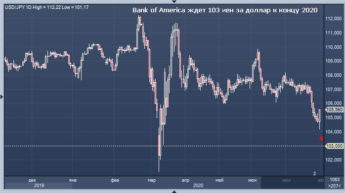 Японская иена должна продолжить укрепляться по отношению к доллару, так как США испытывают затруднения в том, чтобы сдержать распространение коронавируса, говорит Bank of America, который ожидает, что USD/JPY к концу года упадет до 103,00 со 105,52 в настоящее время.
