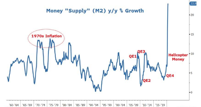 50 лет назад Милтон Фридман сделал известное заявление о том, что «инфляция всегда и везде является монетарным феноменом». Можно смело сказать, что мы никогда не видели такого стремительного роста денежной массы, как сегодня (ProFinance.ru: график в начале статьи отражает динамику М2 в % г/г).