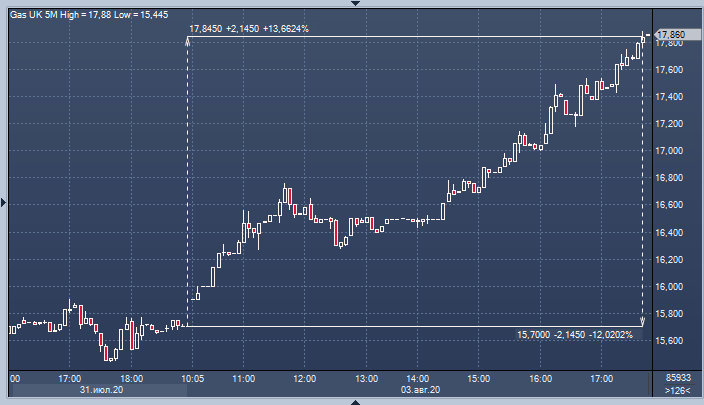 Цены на природный газ в Европе в ходе торгов в понедельник подскочили более чем на 13%: фьючерс на газ с поставкой в сентябре пробил пик июля и достиг максимальной отметки с апреля. В настоящее время он торгуется по 17.84 пенсов за терм, то есть по 1.78 фунта за миллион британских термальных единиц или более 62 фунтов за тысячу кубических метров.