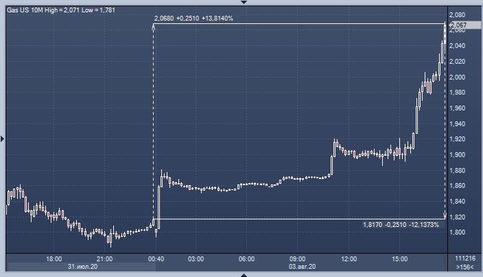 Перспективы жаркой погоды вплоть в период с 8 по 19 августа на Среднем Западе и восточном побережье США поддержали ралли и на американском рынке газа: сентябрьский фьючерс здесь также вырос более чем на 13% и теперь торгуется выше $2 за миллион британских термальных единиц, то есть более $72 за тысячу кубических метров.