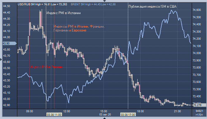 Катализатором резкого разворота российской валюты, которая уже двинулась было в направлении 75 рублей за доллар на фоне слабого индекса PMI в обрабатывающей промышленности (48.4 в июле против 49.4 в июне и прогноза в 50.3), стало общее улучшение аппетита к риску на фоне более сильных, нежели ожидалось, экономических данных из других регионов, и последовавший резкий рост цен на нефть в направлении июльского пика.