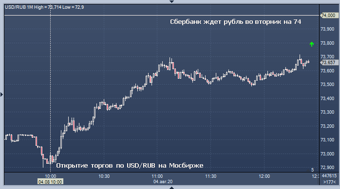 Аналитики Sberbank Investment Research, аналитического подразделения Sberbank CIB, наметили на сегодня целью ослабления рубля 74 за доллар, сославшись на геополитические риски и усиление доллара на форексе.
