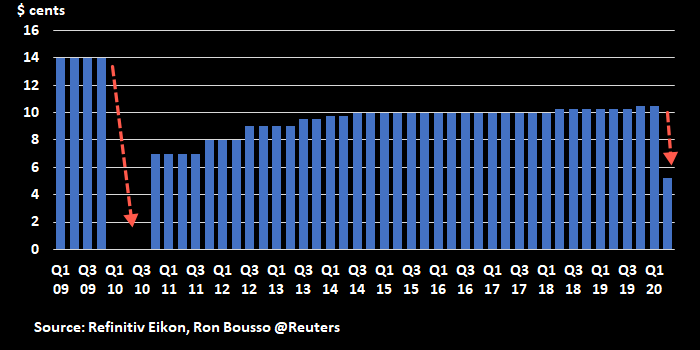 Убыток BP во втором квартале 2020 года составил рекордные $6.7 млрд (см. график выше), и компания объяснила столь слабые результаты резким падением мирового спроса на энергоносители. Эти события заставили британского нефтяного гиганта вдвое сократить размер дивидендов (до 5.25 центов на акцию, см. график ниже), что стало первым сокращением дивидендов за последнее десятилетие. В конце июля аналогичным образом поступила и Royal Dutch Shell, которая снизила размер квартальных дивидендов с $0.47 до $0.16 на акцию.