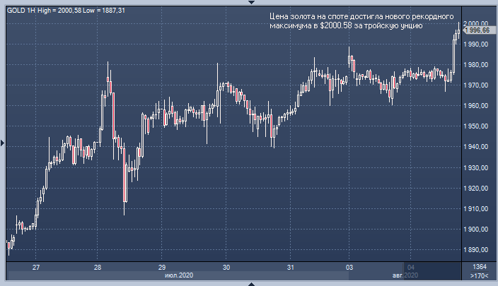 Цена золота на споте в ходе торгов во вторник достигла нового исторического максимума выше $2000 за тройскую унцию. В конце июля ралли драгоценного металла забуксовало на подходе к этой психологически важной отметке, однако спады показали на редкость устойчивый и сильный интерес к покупке, и сегодня быки пошли в наступление, пользуясь новостями о том, что демократы и республиканцы в Конгрессе США продвигаются по пути согласования очередного пакета фискальных мер для стимулирования экономики.