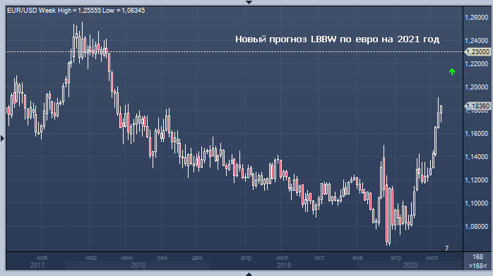 Немецкий банк LBBW, Landesbank Baden-Wuerttemberg, настроен более оптимистично в отношении евро, ожидая, что к середине 2021 года курс евро / доллара вырастет до 1,23 по сравнению с его предыдущим прогнозом в 1,20.