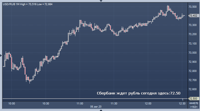 Однако прогнозу Сбербанка, похоже, сегодня не удастся сбыться, поскольку после непродолжительного роста в первые минуты торгов со старта Мосбиржи, рубль снова рухнул — на 90 копеек. Только что мы увидели на графиках отметку 73.50. Причины падения рубля банальны: коррекция доллара на форексе и всего того, что исчисляется в долларах — нефть, газ, акции и т.д. и т.п.
