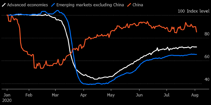Экономическая активность в развивающихся странах за исключением Китая оказалась в августе на 35% ниже докризисных уровней, пишет старший глобальный экономист Bloomberg Бьорн ван Ройе (график выше отражает динамику экономической активности в развитых странах (белым), развивающихся странах, кроме Китая (голубым), и Китая (оранжевым) Уровень 100% соответствует докризисным показателям).