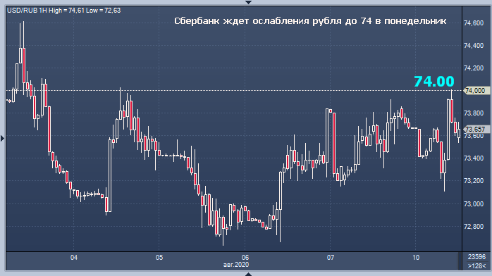Рубль в понедельник может отступить до 74 за доллар, рассказали аналитики Sberbank CIB. сославшись на негативную динамику других валют развивающихся рынков. Валюты EM, как считают в Сбербанке, пострадали от усиления напряженности в отношениях США и Китая, тенденции к укреплению доллара и ухудшения ситуации с коронавирусом в Европе.