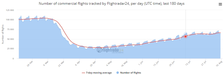 Количество ежедневно совершаемых коммерческих авиаперелетов составляет по состоянию на воскресенье, 9 августа, 64,4 тыс. рейсов, свидетельствует статистика глобального сервиса отслеживания авиарейсов в режиме реального времени Flightradar24. Это все еще заметно ниже, чем до пандемии Covid-19, поскольку в феврале среднее значение за 7 дней составляло 100 тыс. рейсов в сутки. Однако показатель в середине апреля составлял 24 тыс. рейсов в сутки. Соответственно, с тех пор активность увеличилась в 2,7 раза.