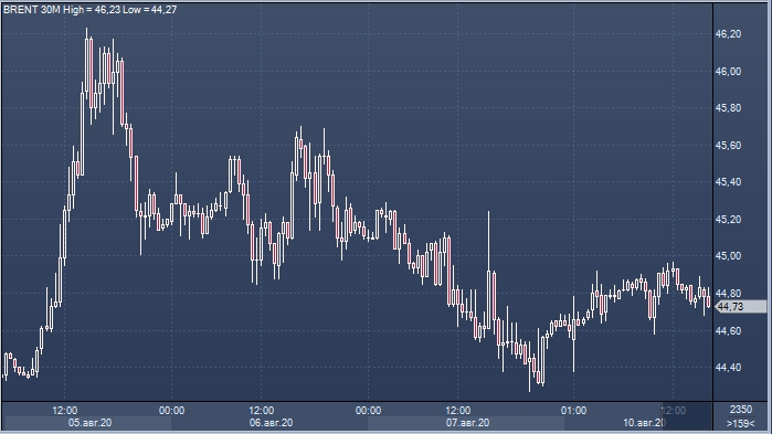 Цены на нефть в понедельник, 10 августа, демонстрируют позитивную динамику. Brent дорожает на 0,9% до $44,80 за баррель, а WTI прибавляет в цене 1,3% до $41,75 за баррель.