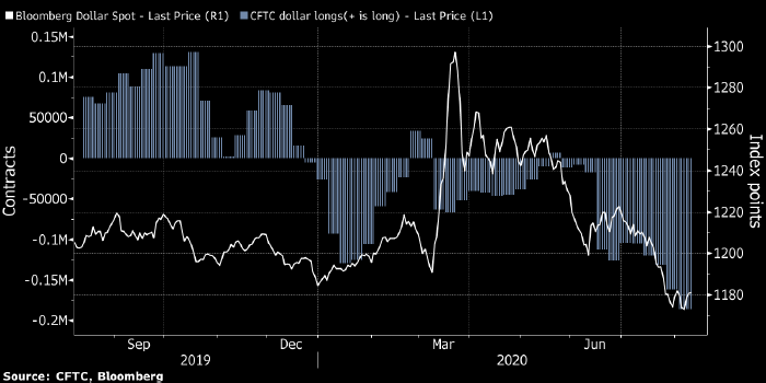 Если они окажутся правы, то неожиданный разворот рынка застигнет инвесторов врасплох, а ликвидация коротких позиций по доллару, объем которых достиг рекордных значений за последние два года, может быстро уничтожить всю накопленную за лето прибыль. Курс доллара снижается с марта, когда ФРС пообещала сделать все возможное для спасения рынков и экономики США, и инвестиционные банки Wall Street пророчат дальнейшее падение американской валюты (ProFinance.ru: график в начале статьи отражает динамику индекса доллара BBDXY и объем чистых спекулятивных ставок по доллару (данные CFTC)).