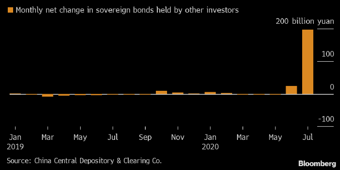 Объем суверенных бондов Поднебесной, принадлежащих «другим» инвесторам (эта категория включает центральные банки и клиринговые дома), вырос в июле на 196.5 млрд юаней до 1.78 трлн юаней, следует из данных Депозитарно-клиринговой корпорации Китая, на которые ссылается Bloomberg.