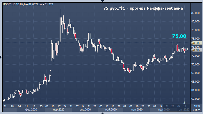 75 рублей за доллар при цене нефти Brent около 45 долл./барр. — такой прогноз дает Райффайзенбанк.