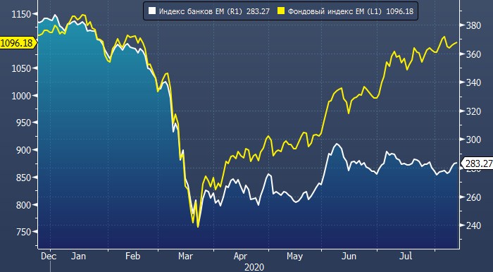 Рынок слишком пессимистично оценивает акции банков развивающихся стран, при том что потенциал банковского сектора Мексики, Бразилии, Индии, России и ЮАР имеет довольно большой потенциал роста, пишут эксперты Goldman Sachs. Они напоминают, что с начала года бумаги банков развивающихся стран, входящие в индекс MSCI, снизились примерно на 25%, тогда как аналогичные бумаги технологических компаний выросли примерно на 16% (ProFinance.ru: график в начале статьи показывает, что после отскока с минимумов марта фондовый индекс MSCI показал намного лучшую динамику, чем индекс банков EM).