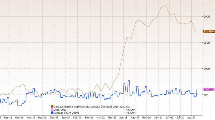 Объем запасов нефти в танкерах, которые находятся в неподвижном состоянии, по крайней мере, 7 дней, по состоянию на 14 августа составил 171.489 млн баррелей. Об этом сообщает агентство Bloomberg со ссылкой на данные Vortexa. По сравнению с предыдущей неделей запасы сократились на 10.4% и достигли минимального значения с мая этого года. Однако, до нормализации ситуации еще далеко — объём запасов в 2.8 раза превышает уровень, зафиксированный 16 августа 2019 года.