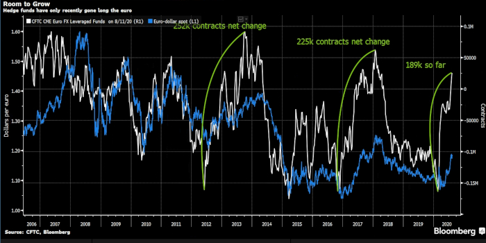 Некоторые хедж-фонды заявляют, что короткая позиция по доллару сейчас перенасыщена, в то время как аналитики призывают к возможной коррекции евро из-за чрезмерно растянутого позиционирования. Тем не менее, данные CFTC показывают, что инвесторы с заемными средствами только недавно вошли в чистую длинную позицию по евро и не на данный момент пока еще не достигли исторически экстремальных уровней оптимизма.