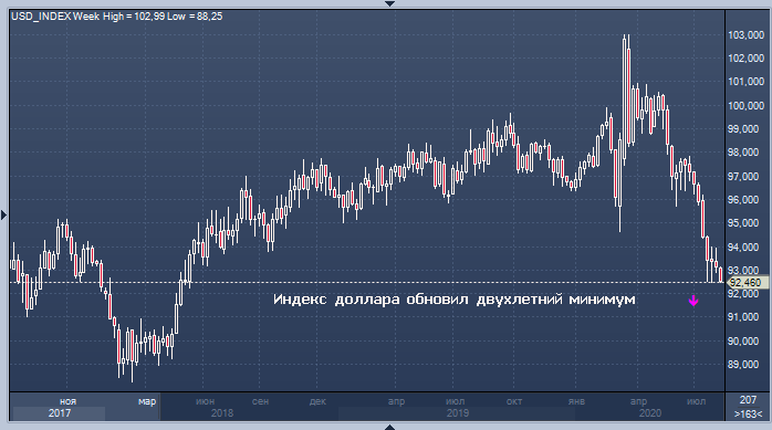 Индекс доллара упал на 0,3% до 92,55 за доллар США, закрывшись на двухлетнем минимуме 92,49.