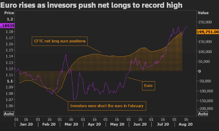 Инвесторы как со своими деньгами, так и с заемными средствами предпочитали выражать свое негативное мнение о долларе с помощью самой торгуемой валютной пары в мире - евро/доллар - подталкивая длинные позиции по евро к новому рекордному максимуму за неделю до 11 августа, как показали последние данные CFTC.