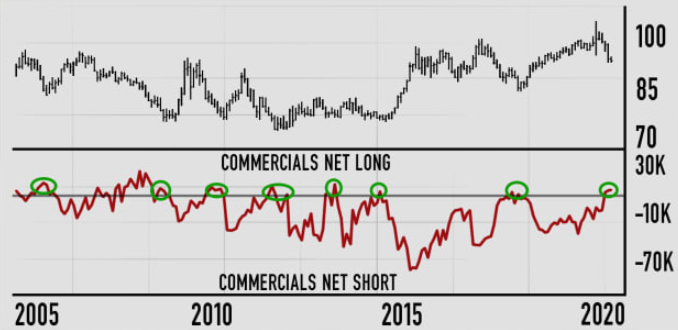 «Ларри Уильямс указывает, что как только коммерческие хеджеры занимают чистую длинную позицию над черной линией (во фьючерсах на DXY, см. график ниже - прим. ProFinance.ru), то индекс доллара имеет тенденцию к сильному росту», - отметил Джим Крамер. - «Как раз сейчас коммерческие хеджеры заняли чистую длинную позицию по доллару, что бывает нечасто, и это говорит в пользу покупки американской валюты».