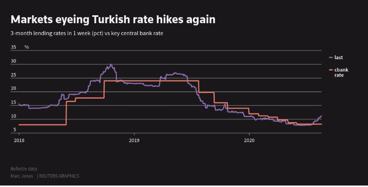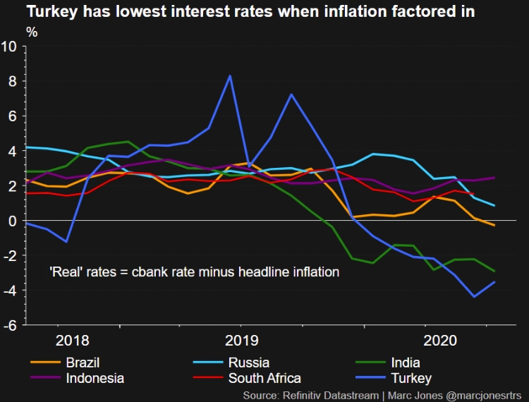 Коронавирус вызвал серьезное сокращение экономики, что по идее оправдывало сокращение стоимости заимствований. Однако масштаб снижения ставок оказался таким, что вкладчики, которые размещают свои средства на депозитах в банке в стремлении заработать на процентах, и инвесторы, которые зарабатывают на государственных облигациях, больше не получали компенсации за инфляцию в Турции, которая по-прежнему выражается двузначными числами.